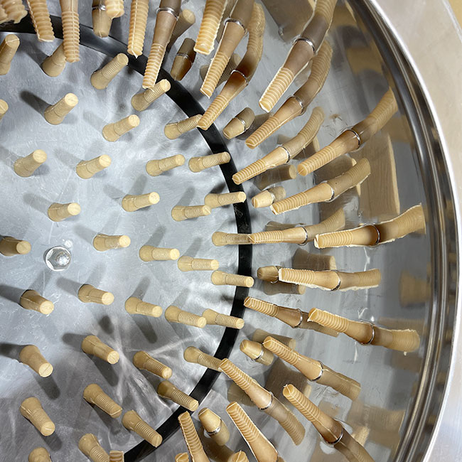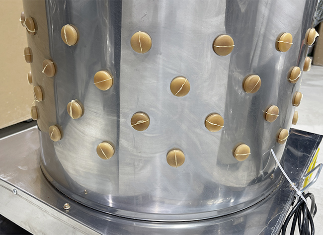 Máy sử dụng núm cao su tự nhiên đàn hồi tốt, bố trí đều trong lồng và mâm quay. Bộ phận này giúp tạo lực ma sát vừa đủ để bứt lông sạch mà không gây tổn thương thân gia cầm. Sau mỗi mẻ, gà – vịt được làm sạch lông nhưng vẫn giữ hình dáng đẹp, không bị trầy rách hay bầm tím.